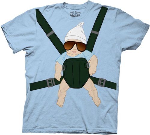 This adult T-shirt is an officially licensed product from the movie The Hangover. The shirt features our cool Baby Bjo! rn (Baby Carrier) design printed on 100% cotton.